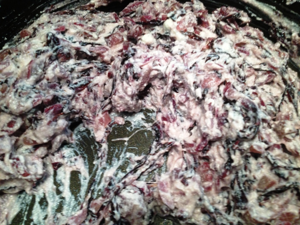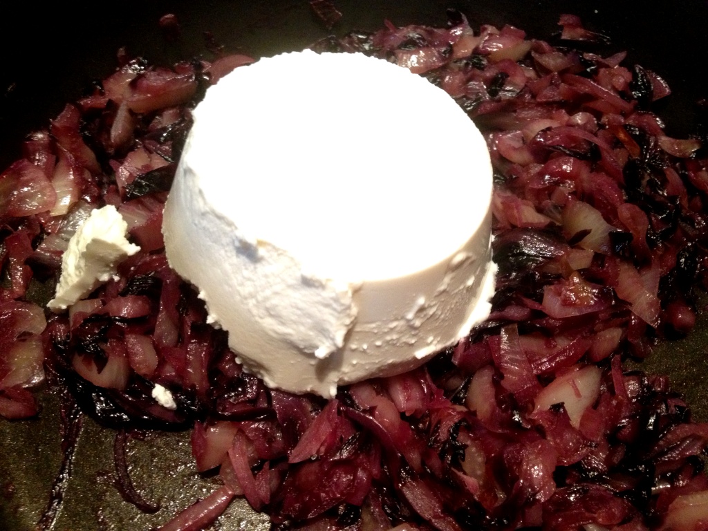 Stufare in una padella cipolla e trevisana tagliata sottile con un filo d’olio un po’ di acqua e il vino, insaporire con il dado in polvere.