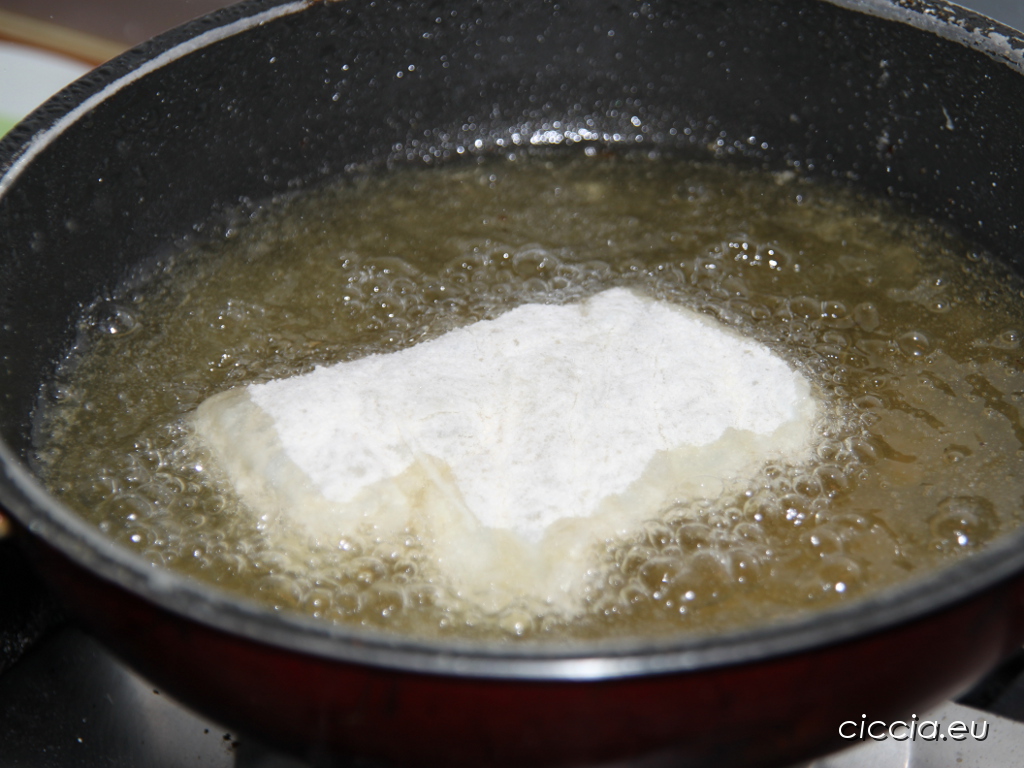 Mettete a bagno il baccalà per almeno 12 ore, cambiando spesso l’acqua. Eliminate la pelle e tagliatelo a pezzettini piccoli che, infarinati accuratamente, farete friggere in abbondante olio di oliva.
