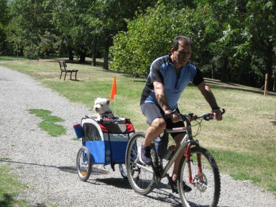 - – linea ammortizzata legata alla bici e tenuta in tensione con un’antenna. Si può fare a meno dell’antenna, ma la linea (quella che viene usata anche per il dog-trekking o il cani-cross) è necessaria. Va bene anche un guinzaglio lungo (non più di 2 mt): l’importante è che il conduttore possa tenere entrambe le mani sul manubrio!