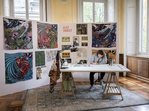 Tutto respira i colori e quasi quasi si percepisce il fruscio della seta , dalle tute della prossima collezione che indossano le hostess ai carrè che fanno da divisa a tutti gli organizzatori.