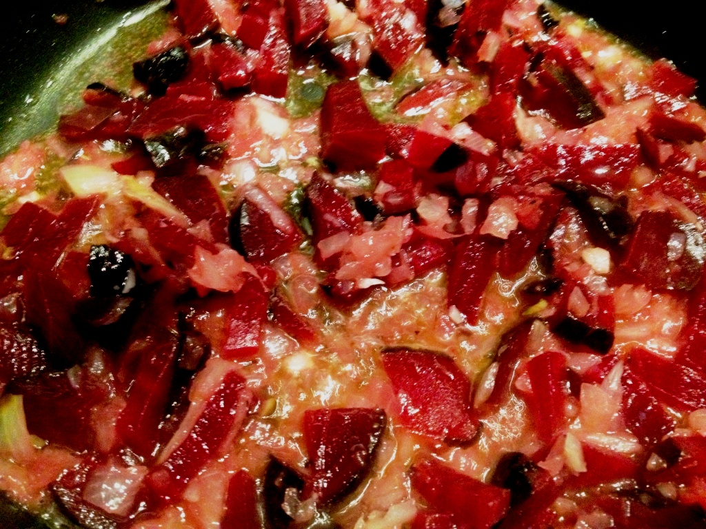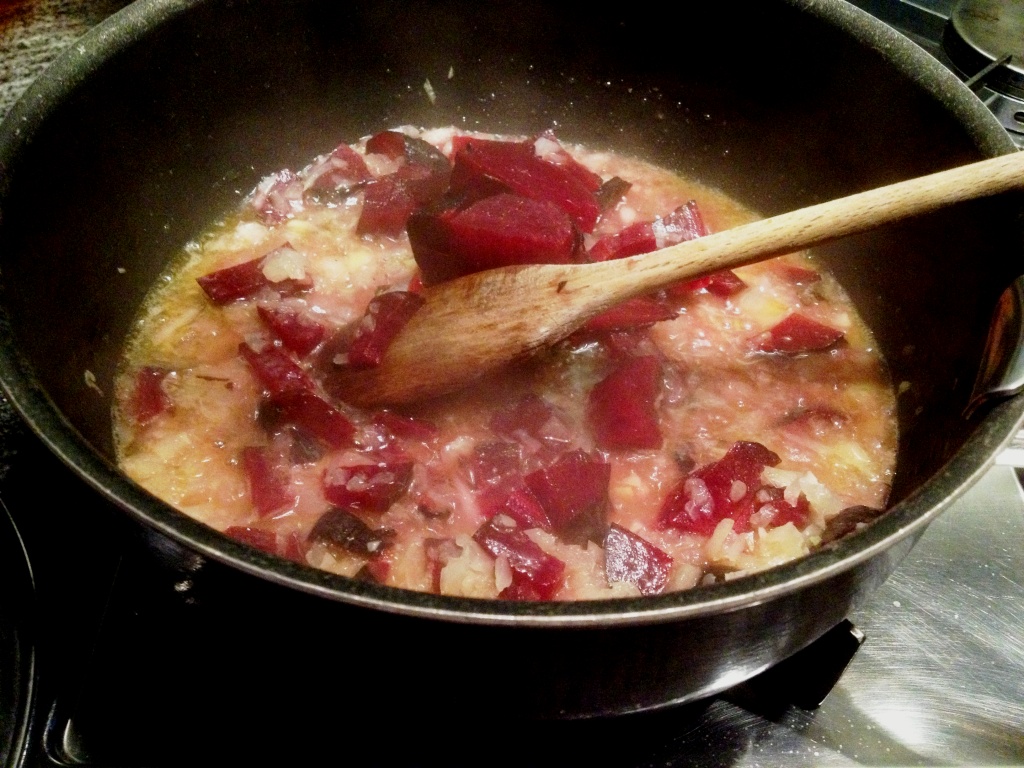 Ero in ascolto e la ricetta mi ha incuriosito da morire, così ho preso nota e fatto mente locale degli ingredienti nel mio frigo e….avevo barbabietola acquistata proprio l’altro ieri e cipolle di montagna coltivate da un amico di mio figlio.