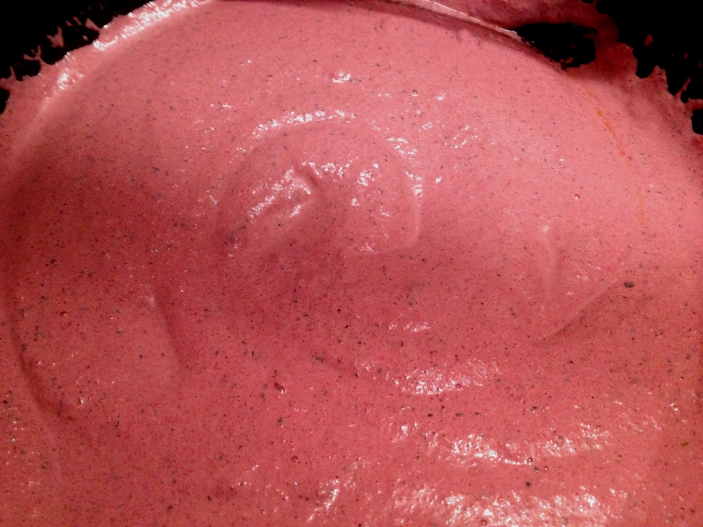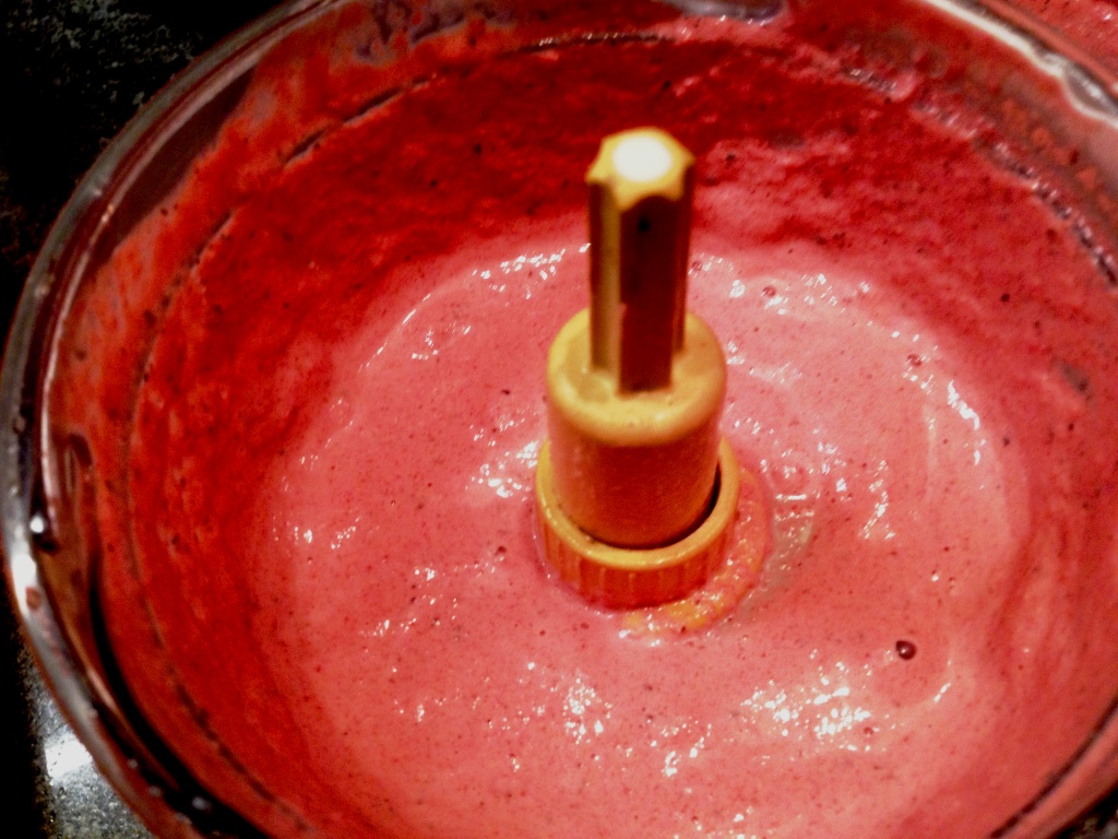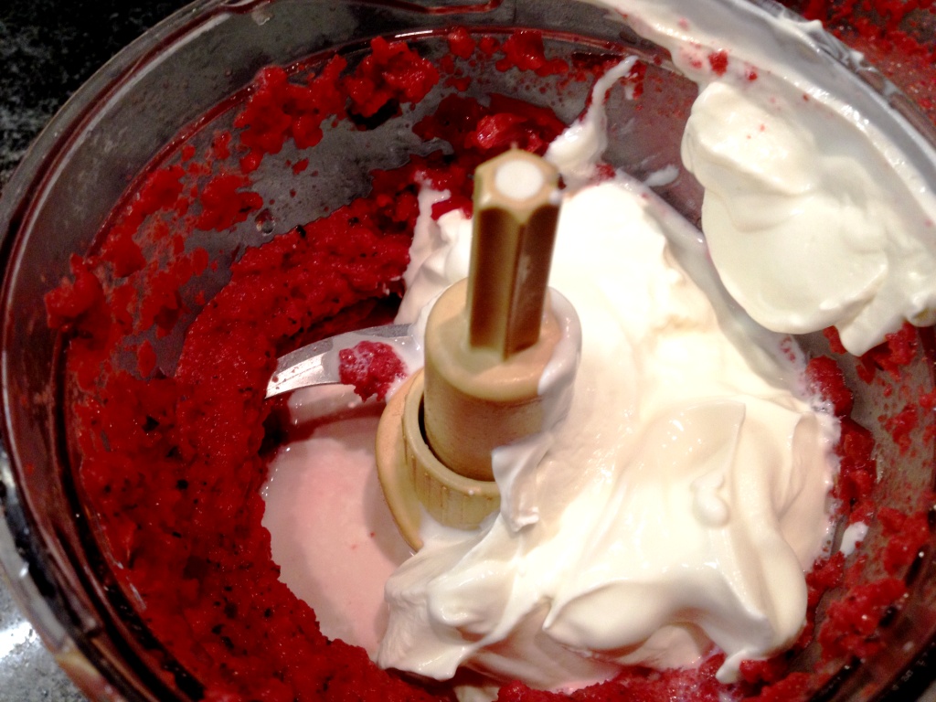 Frullare le barbabietole e aggiungerci tanta panna quanto basta per ottenere il colore fuxia/rosa.