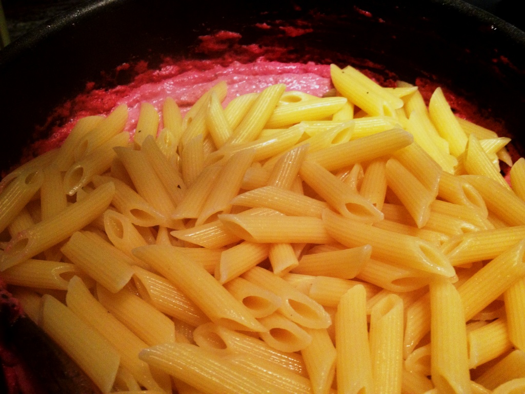 Rimettere in padella il sughetto di Barbabietole e aggiungerci il succo di mezzo limone. Colare la pasta mantenendo SEMPRE un bicchiere di acqua di cottura ( non si sa mai)