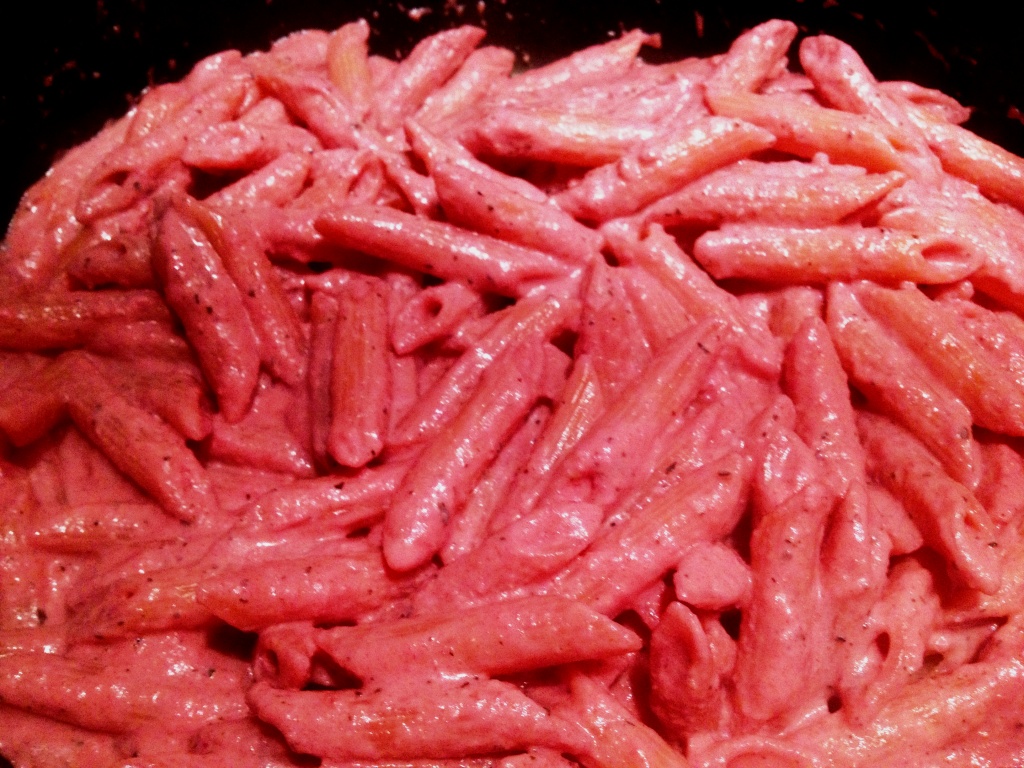 Far saltare la pasta in padella con il sugo fuxia/rosa.