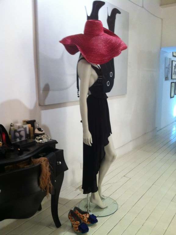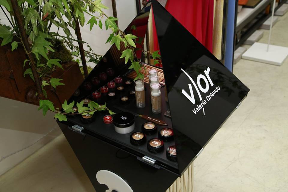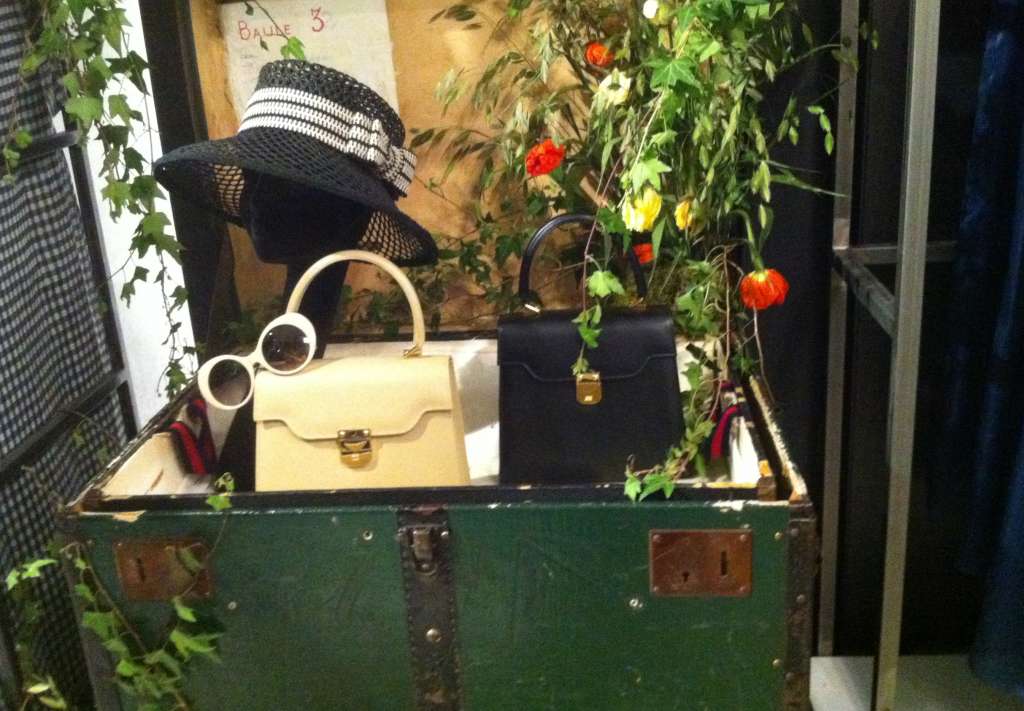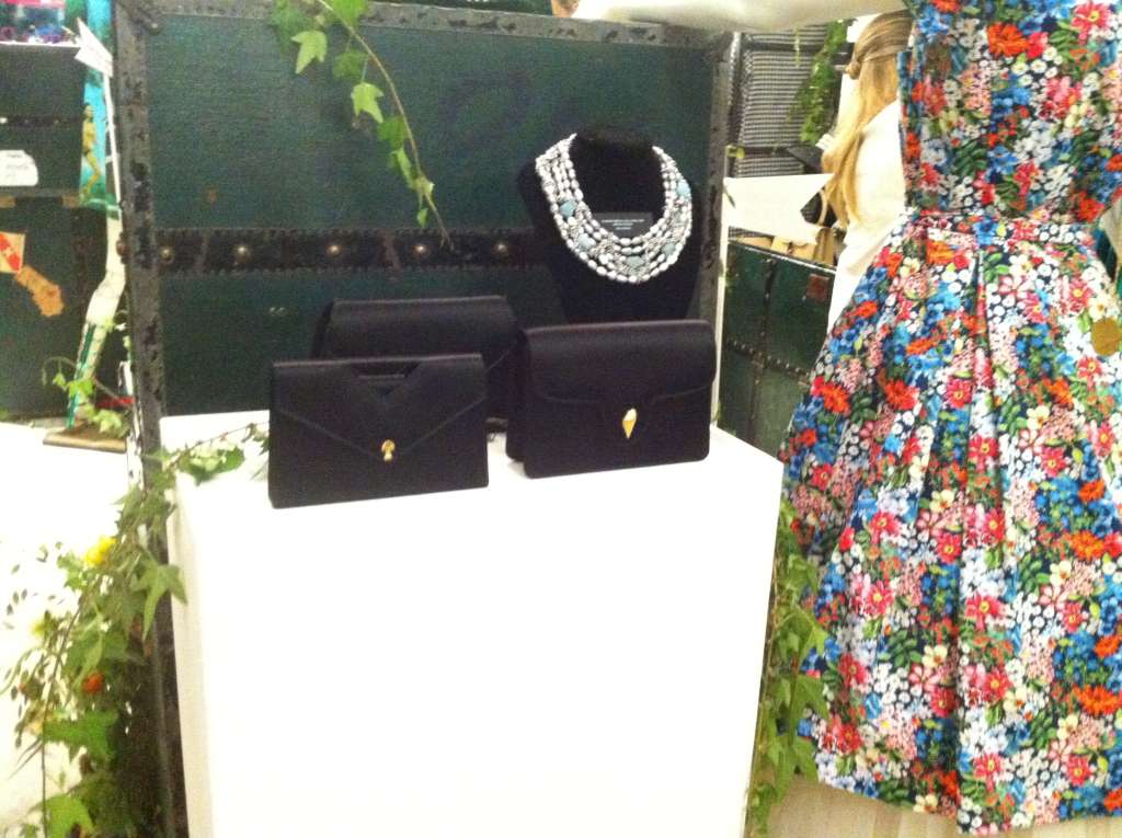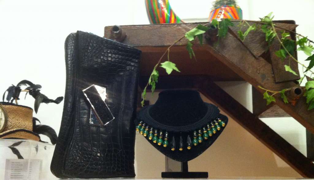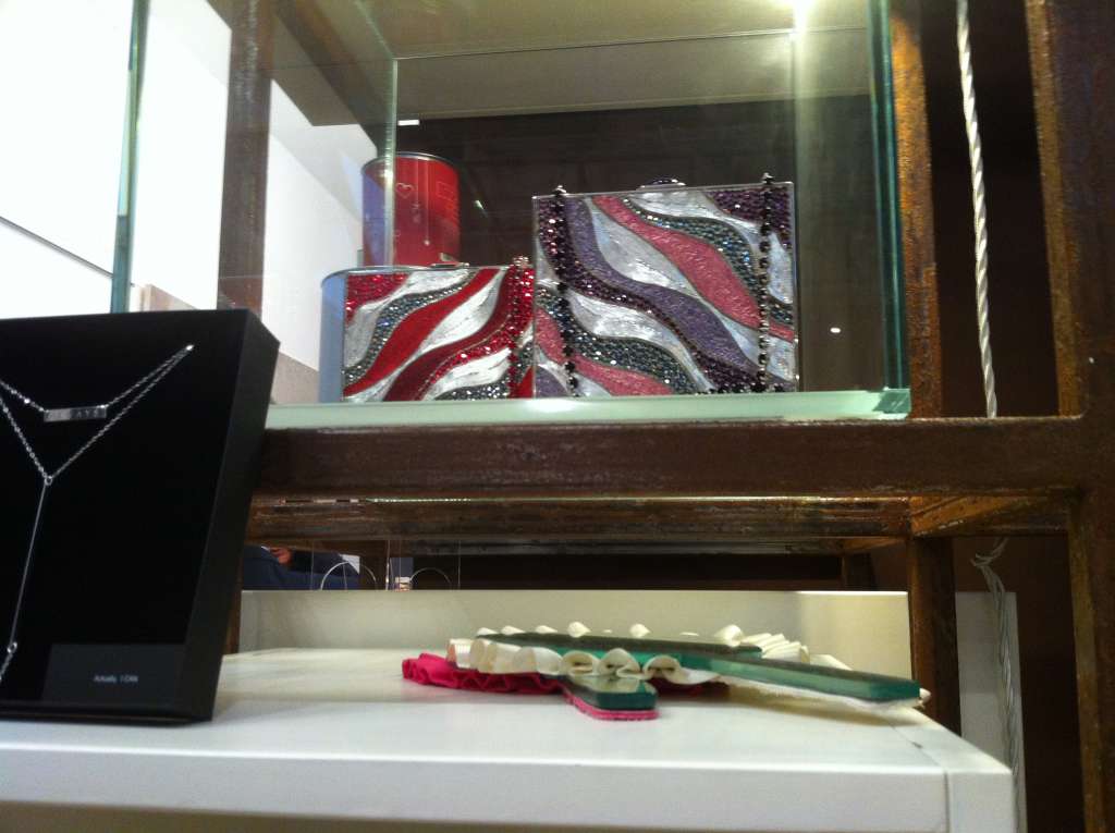 L’allestimento e’ volto alla sensorialita’, ed entrando si ha la sensazione di entrare  nel Paese di Alice, ci si rende conto che tutto quello che circonda va osservato con attenzione perché  ha un fil rouge che in qualche modo conduce tutta l’atmosfera in un avvolgimento sensoriale e visivo. Colori, prodotti, piante, oggetti.  Una vasca di pesci rossi si accompagna ad una borsa di struzzo Orangine. In effetti ci si domanda che c’entra ma quella borsa, la sua forma,  a fianco alla trasparenza del vetro, col richiamo di colore dei pesci sta d’incanto in quel contesto.