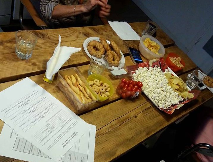 Nella realtà l’inaugurazione della mostra era un pretesto per rivederci noi di Job Clube continuare una tradizione iniziata in primavera di trovarci, parlare di lavoro o altro ma sempre davanti ad un bicchiere di vino e qualcosa da spiluccare insieme, meglio se fatto in casa come una torta salata meravigliosa di Isabella, o il vino bianco ghiacciato imbottigliato da lei.