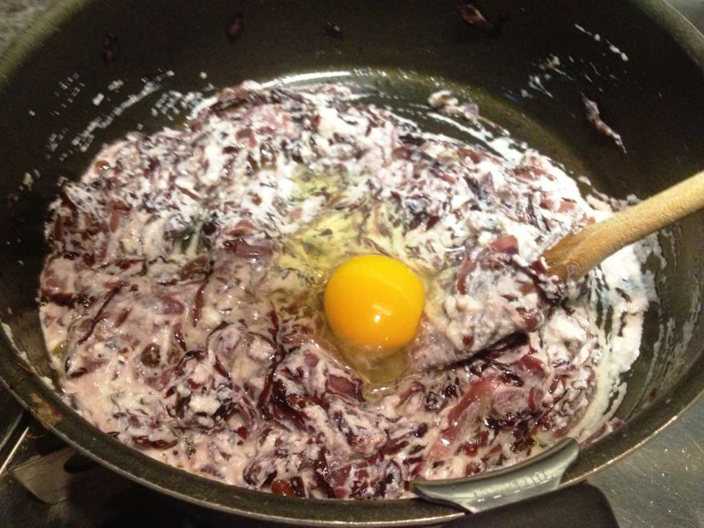 Quando il composto si e’ raffreddato aggiungere la ricotta amalgamando bene tutto il composto. Aggiungere un uovo e sale per insaporire, volendo un po’ di pepe.