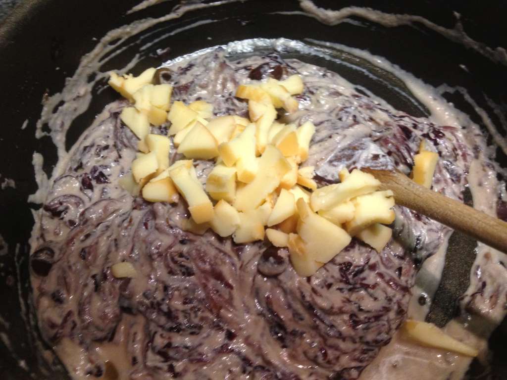 Tagliare sottile cipolla e trevisana e mettere a stufare in padella con olio, se asciuga troppo in fretta aggiungere 1 /2 bicchiere d’acqua e portare a cottura.