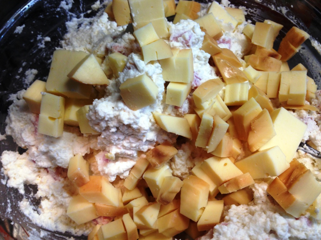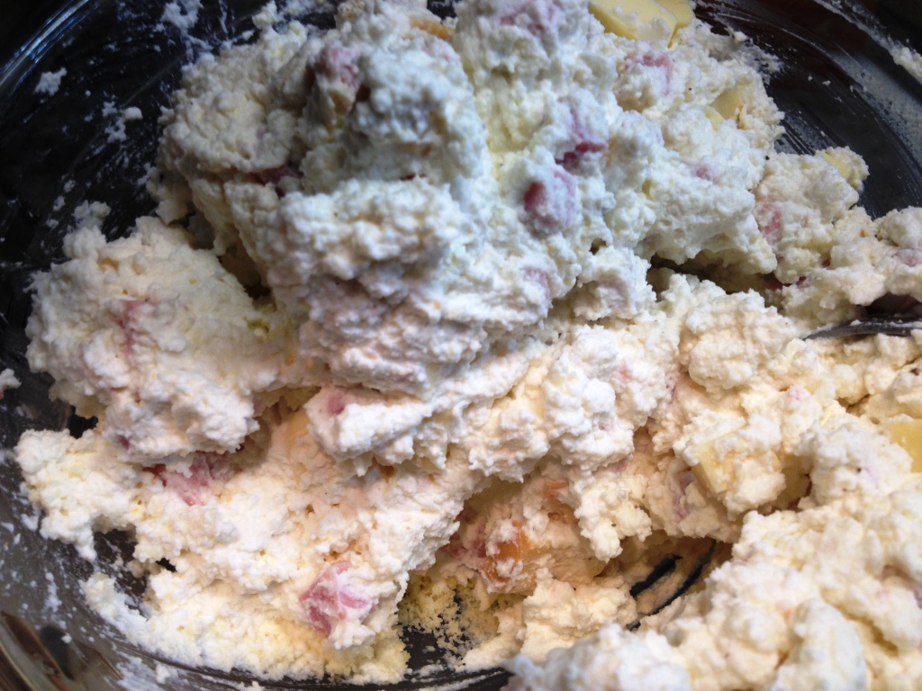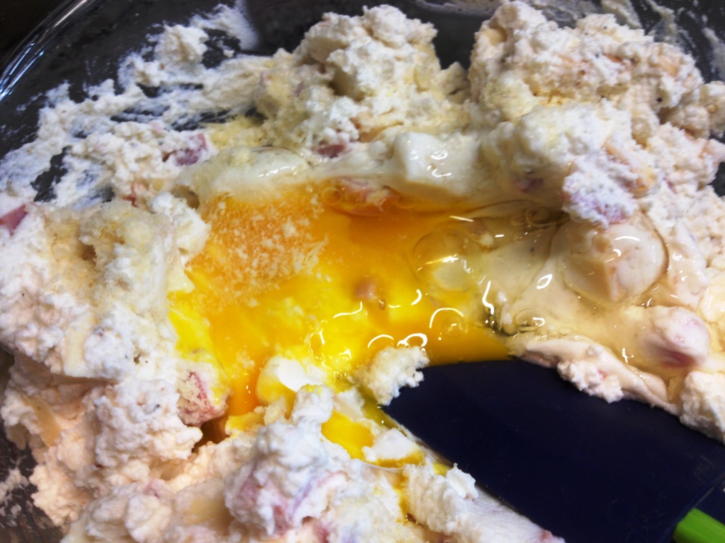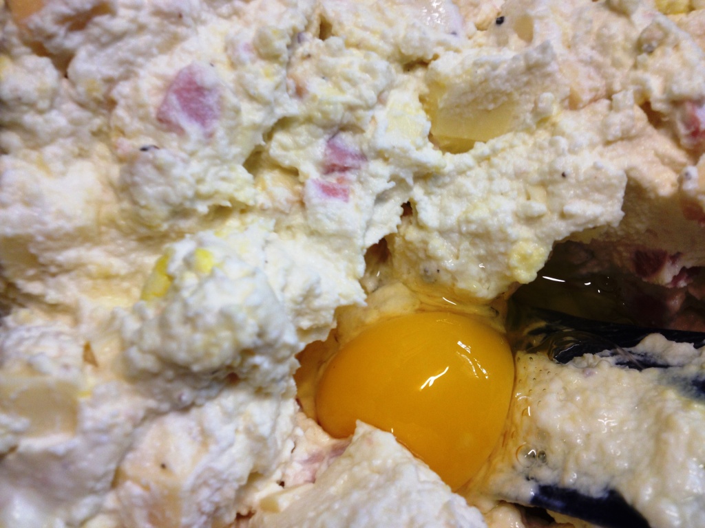 Mettere in una grande ciotola la ricotta, il prosciutto e la provola a dadini, girare bene, aggiungere il parmigiano o il pecorino grattugiato e girare bene. Deve risultare un impasto omogeneo e i dadini devono essere ben distribuiti. Assaggiare e verificare se bisogna correggere di sale. Aggiungere prima un uovo e un pizzico di sale e girare, se necessario ( ossia l’impasto risulta troppo denso) aggiungere l’altro uovo.