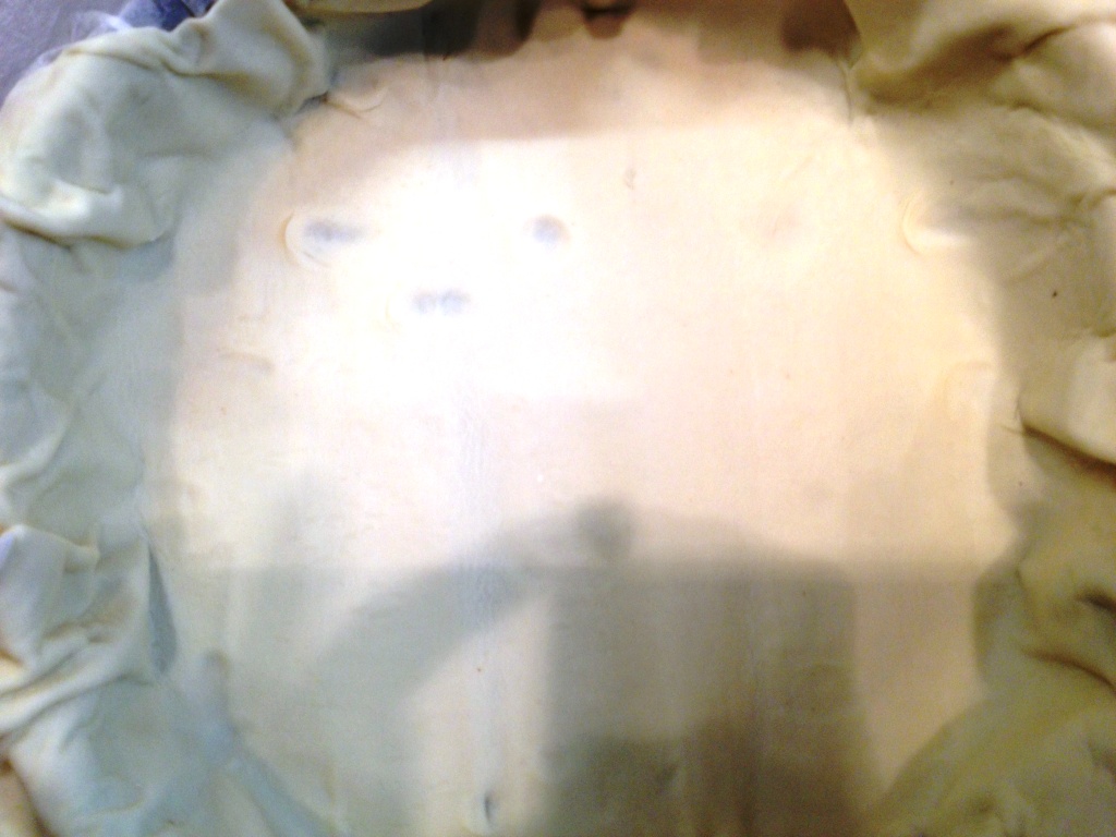 Preparare una teglia con carta forno e stendere una sfoglia, bucare la pasta e disporre il composto. Sbatterla su un piano per riempirla bene. Coprire con l’altra sfoglia e sigillare tutta intorno. Bucare anche questa sfoglia con una forchetta. Io non uso uova da spennellare sulla sfoglia, ma volendo si puo’ farlo.