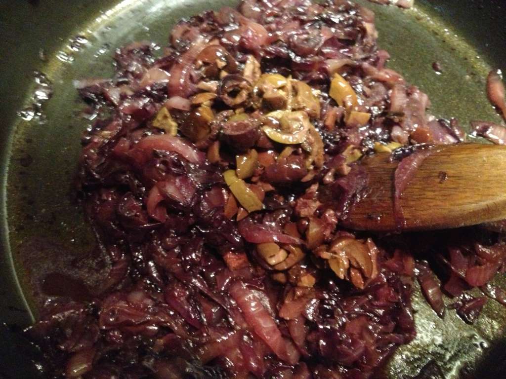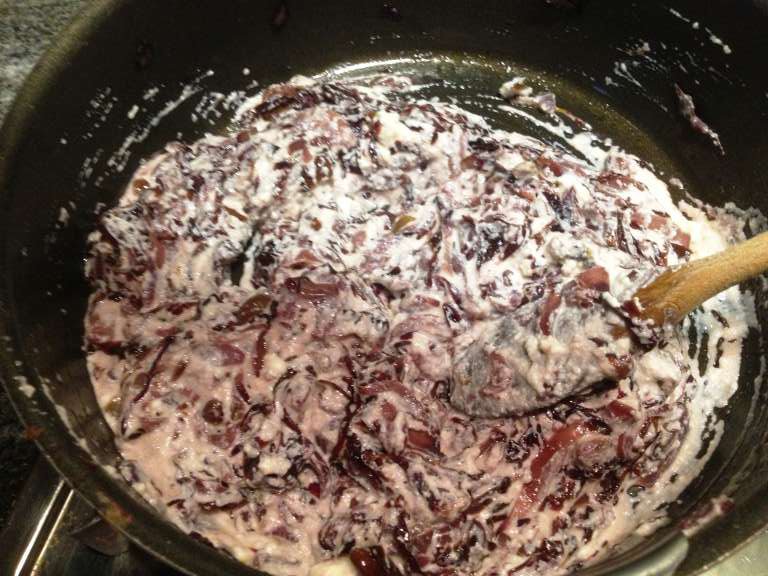 Tagliare sottile cipolla e trevisana e mettere a stufare in padella con olio, se asciuga troppo in fretta aggiungere 1 /2 bicchiere d’acqua e portare a cottura.