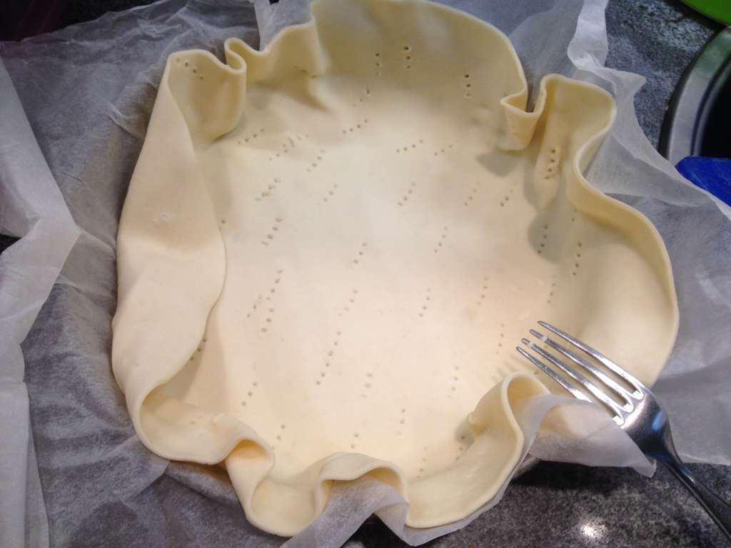 Nel frattempo mettere la sfoglia in uno stampo di 24 cm. di diametro con relativa carta forno sotto. Bucare con una forchetta la sfoglia e versarvi dentro tutto il composto stando attenti che la provola capiti in modo uniforme dappertutto.