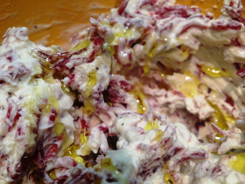 Mettere caprini e ricotta in una ciotola e iniziare a lavorarli con una forchetta, aggiungere la bresaola che se risulta a fili troppo lunghi va prima un po’ sminuzzata con le forbici. Girare e aggiungere un filo d’olio e sale (se necessario). Aggiungere una bella spolverata di pepe verde e quando il composto è ben omogeneo fare un’ ultima girata aggiungendo qualche frutto rosso per distribuirlo all’interno dell’impasto.