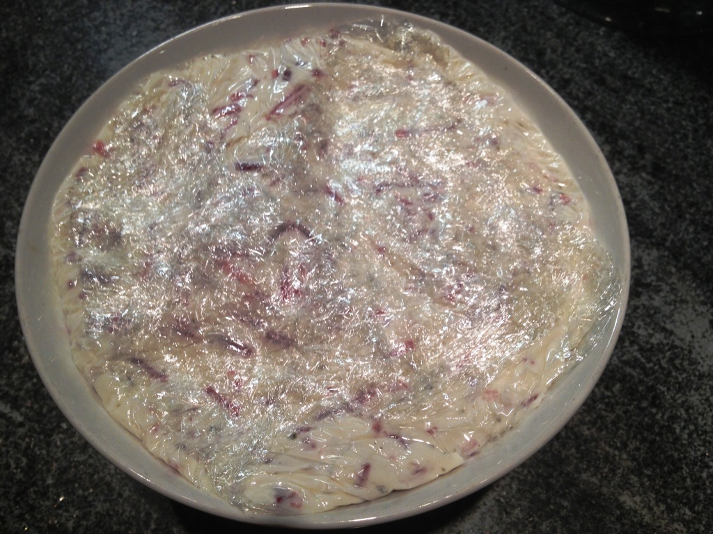 Preparare una ciotola col fondo tondo o tipo budino, rivestirla di pellicola, mettere dei fili di bresaola al centro e adagiarci il composto stando attenti che riempia bene la ciotola fino in fondo. Chiudere l’eccesso di pellicola e mettere in frigo per un paio d’ore.